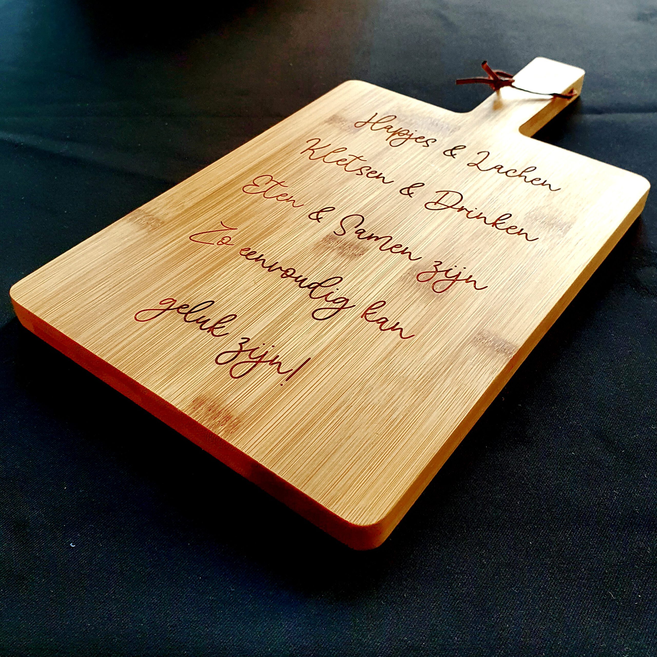 Hapjes & Lachen, Kletsen & Drinken, Eten & Samen zijn. Zo eenvoudig kan geluk zijn. Dit is de tekst, die in deze bamboe snijplank is gegraveerd.