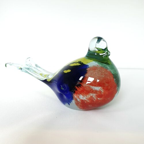 De bonte vogel van glas heeft oa de kleuren blauw, geel, groen en oranjerood op zijn buikje. En verder is het gemaakt van helder glas.
