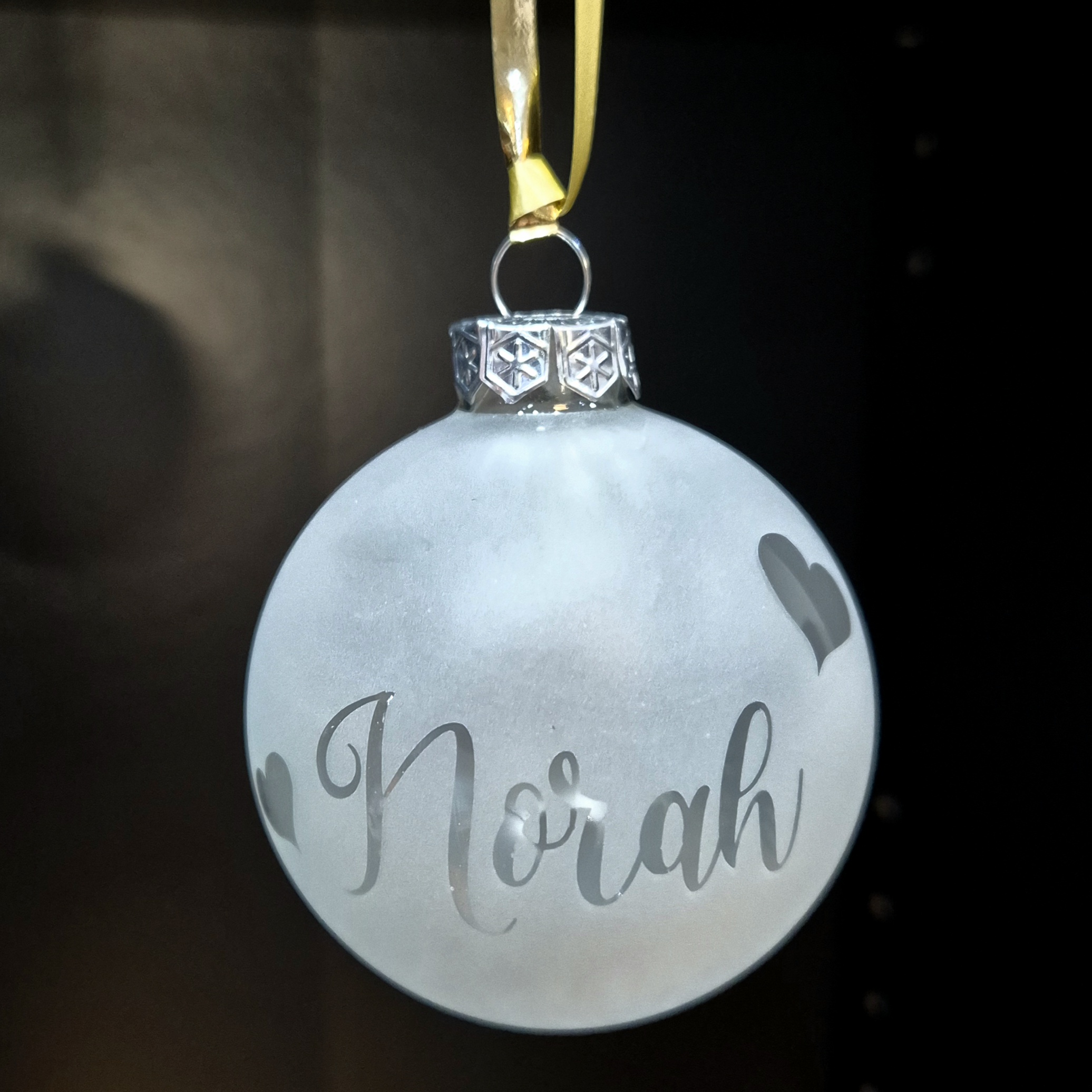 Deze glazen kerstbal met jouw eigen naam heeft een gematteerde achtergrond of ondergrond en de eigen naam blijft helder glas. Net als de hartjes.