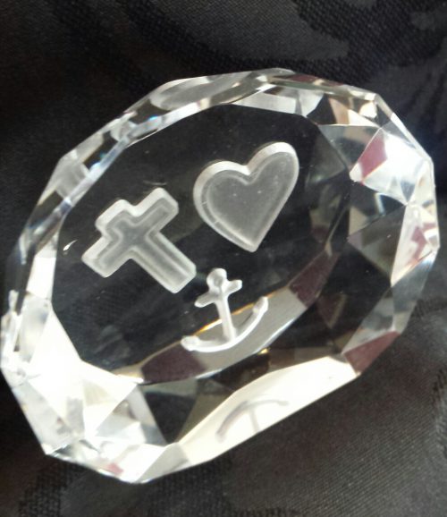 Mooi geslepen brokje kristal met daarin de tekens Geloof, Hoop en Liefde.