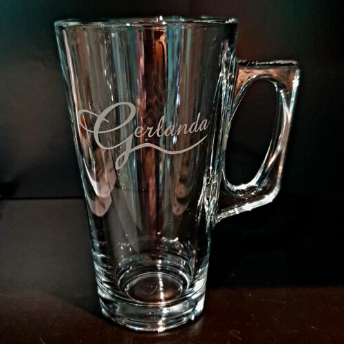 De naam wordt met een sierlijke letter in het Latte Macchiatoglas gegraveerd, waarbij de eerste letter van de naam groter en met extra krullen en lijnen wordt gegraveerd.