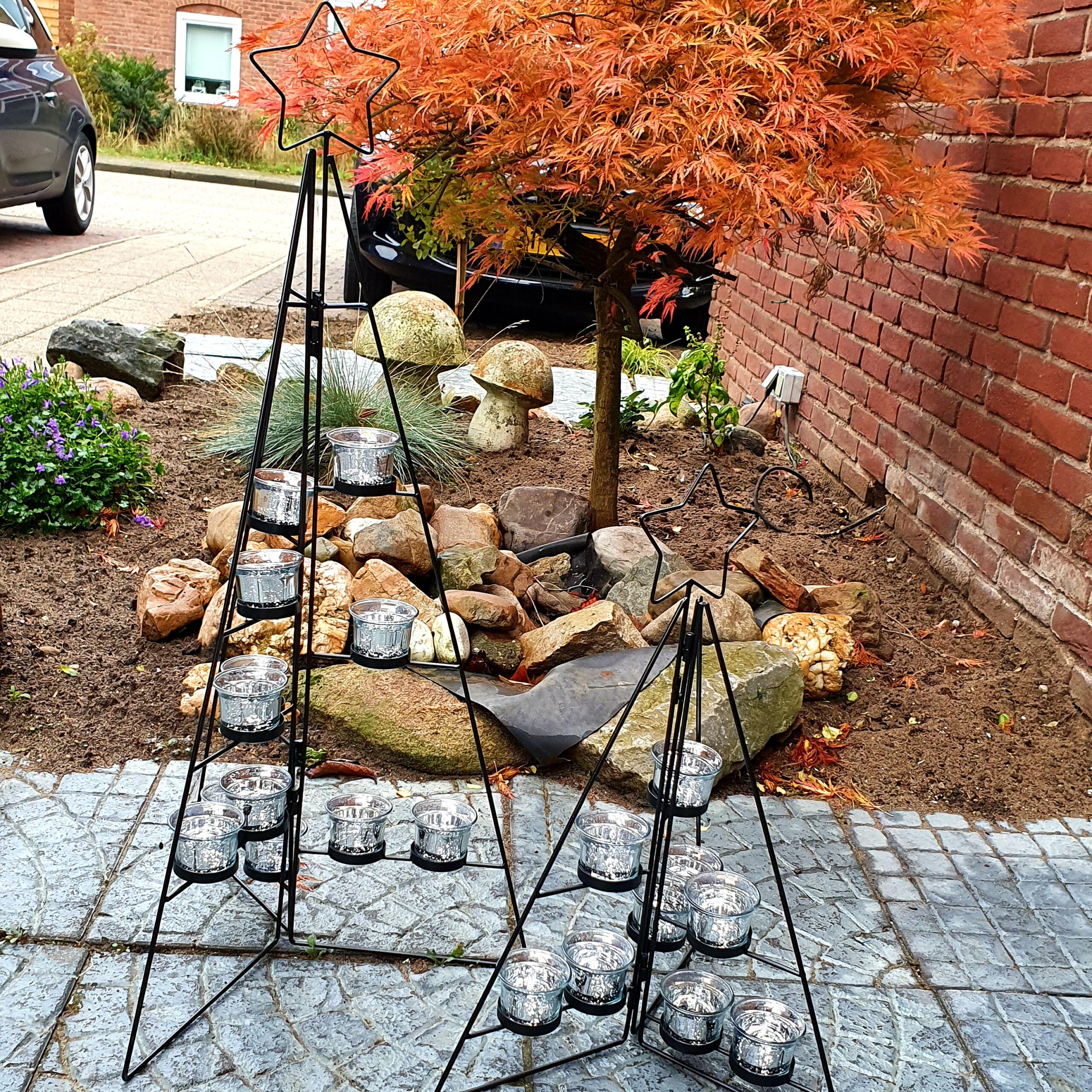 De kerstboom bestaat uit een zwart frame met daarin dragers voor de glazen sfeerlichtjes.