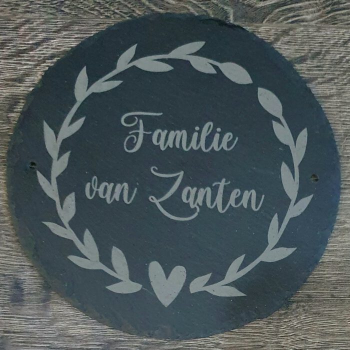 Een naambord van leisteen, met daarin de namen en het huisnummer gegraveerd, in strak design.