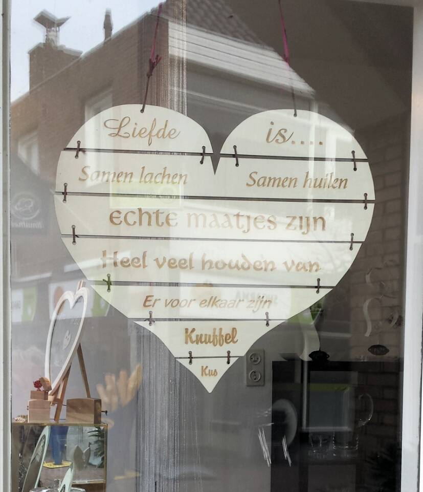 Samen lachen Samen huilen, Echte maatjes zijn, Heel veel houden van, Er voor elkaar zijn, Knuffel en Kus. De tekst op de houten raamhanger.