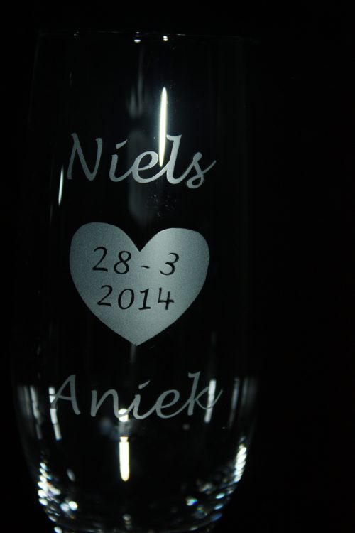 2 Champagneglazen met daarin de namen van het bruidspaar gegraveerd. In het midden een hart met daarin de trouwdatum of het aantal jaren getrouwd (met ringetjes).