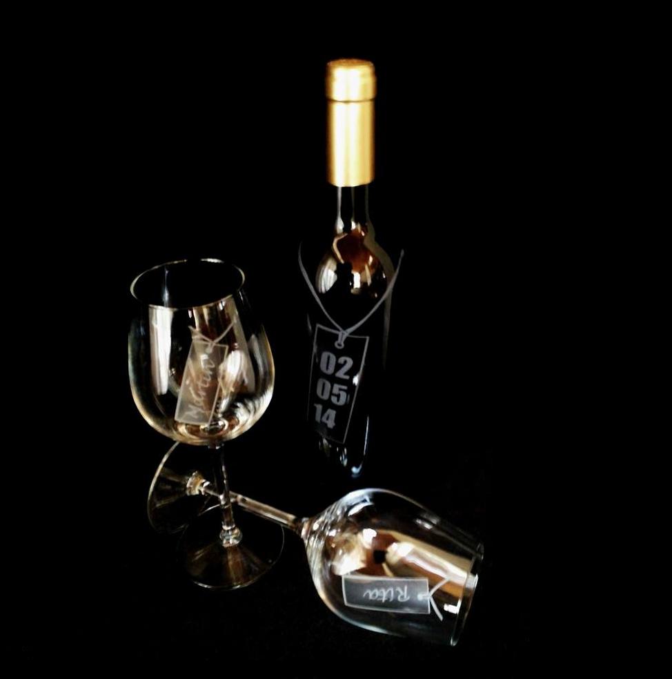 Vul hieronder de namen en trouwdatum in. De namen komen op de glazen te staan en de datum op de fles, zoals op de afbeeldingen hiernaast te zien is.