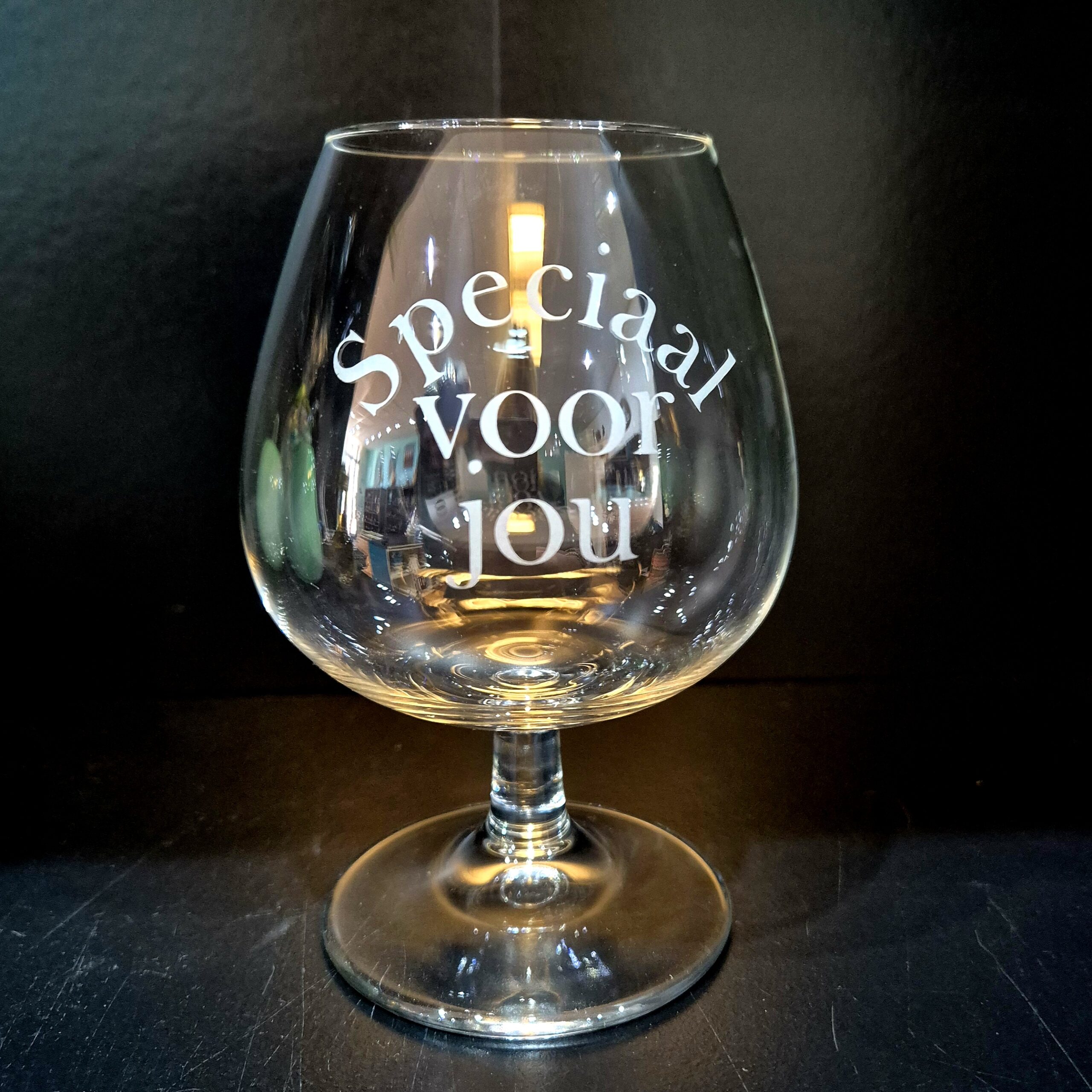Speciaal voor jou is in het cognacglas gegraveerd dmv zandstralen. de gravure zal daardoor niet scherp aanvoelen. Wel zo fijn, als je een slokje uit het cognacglas wil nemen.