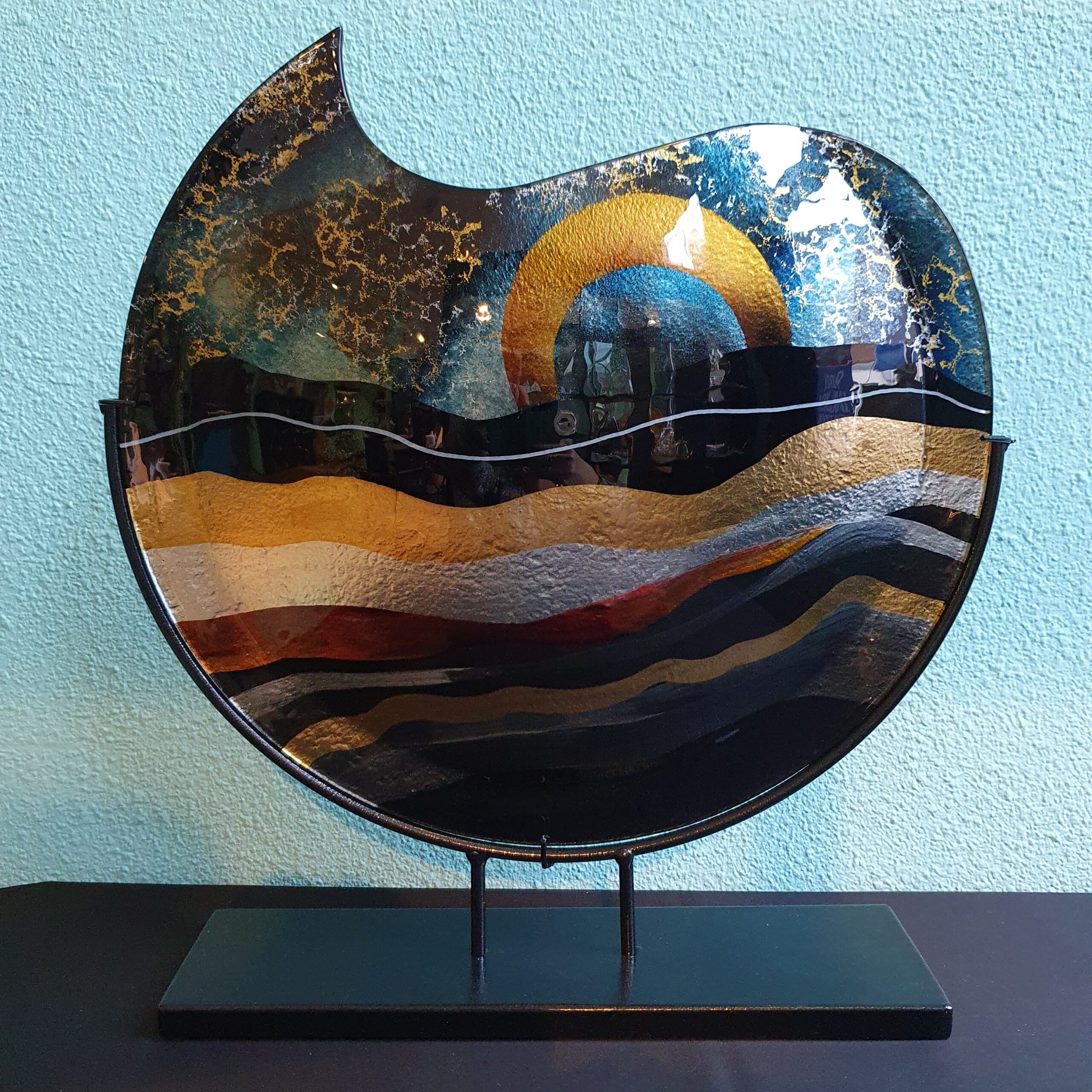 Glaskunst, een ronde vaas op een zwart frame met voet, uitbeeldend een zonsondergang.