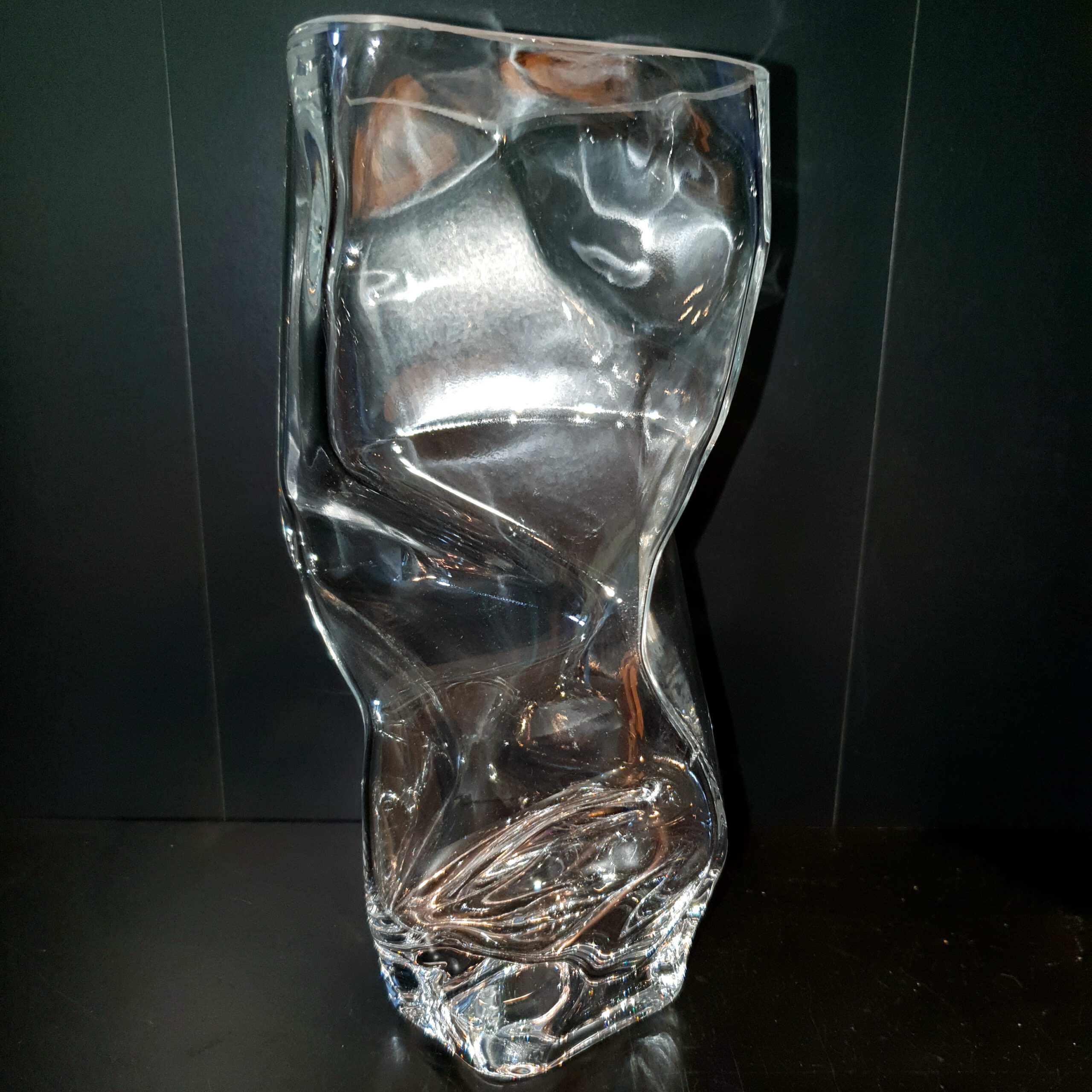 Een hele bijzondere glazen vaas, waarbij het lijkt dat het glas in elkaar gedrukt is. Alsof de glazen vaas helemaal ingedeukt is.