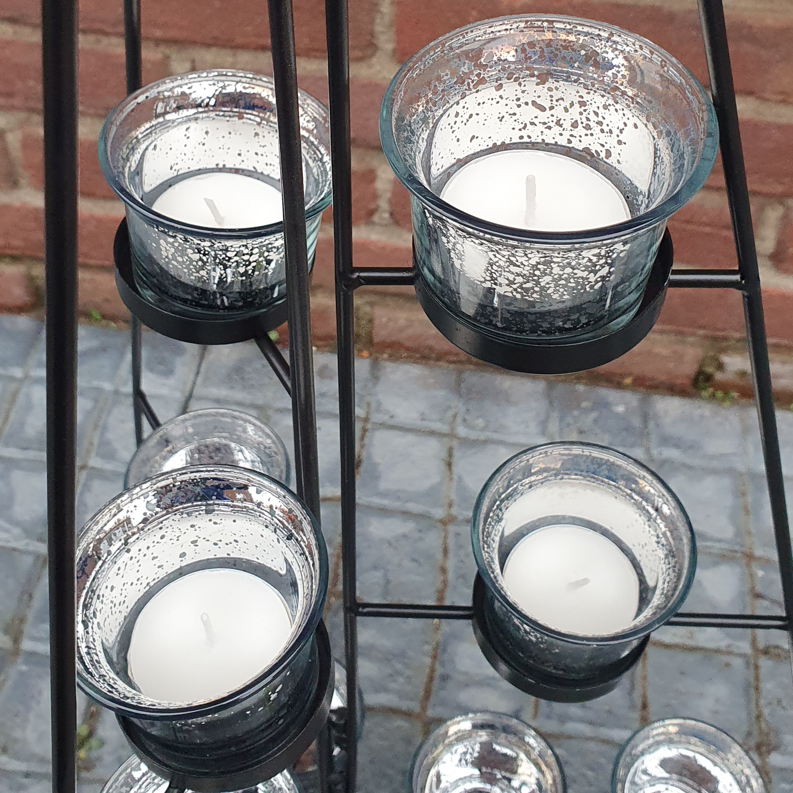 Die Lichter sind aus Glas und haben einen silbernen Look. Ein kleines Teelicht passt in das Glas.