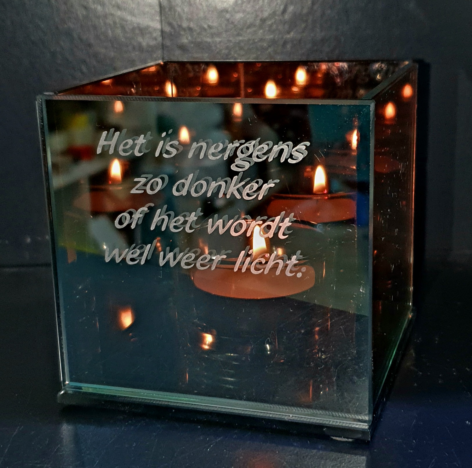 In het midden van het vierkante sfeerlicht zit 1 houdertje voor een klein theelichtje. Maar door het weerspiegelen in het glazen vierkant er om heen lijken het wel duizend lichtjes! Zo mooi, die „duizend lichtjes“, een heel bijzonder effect.